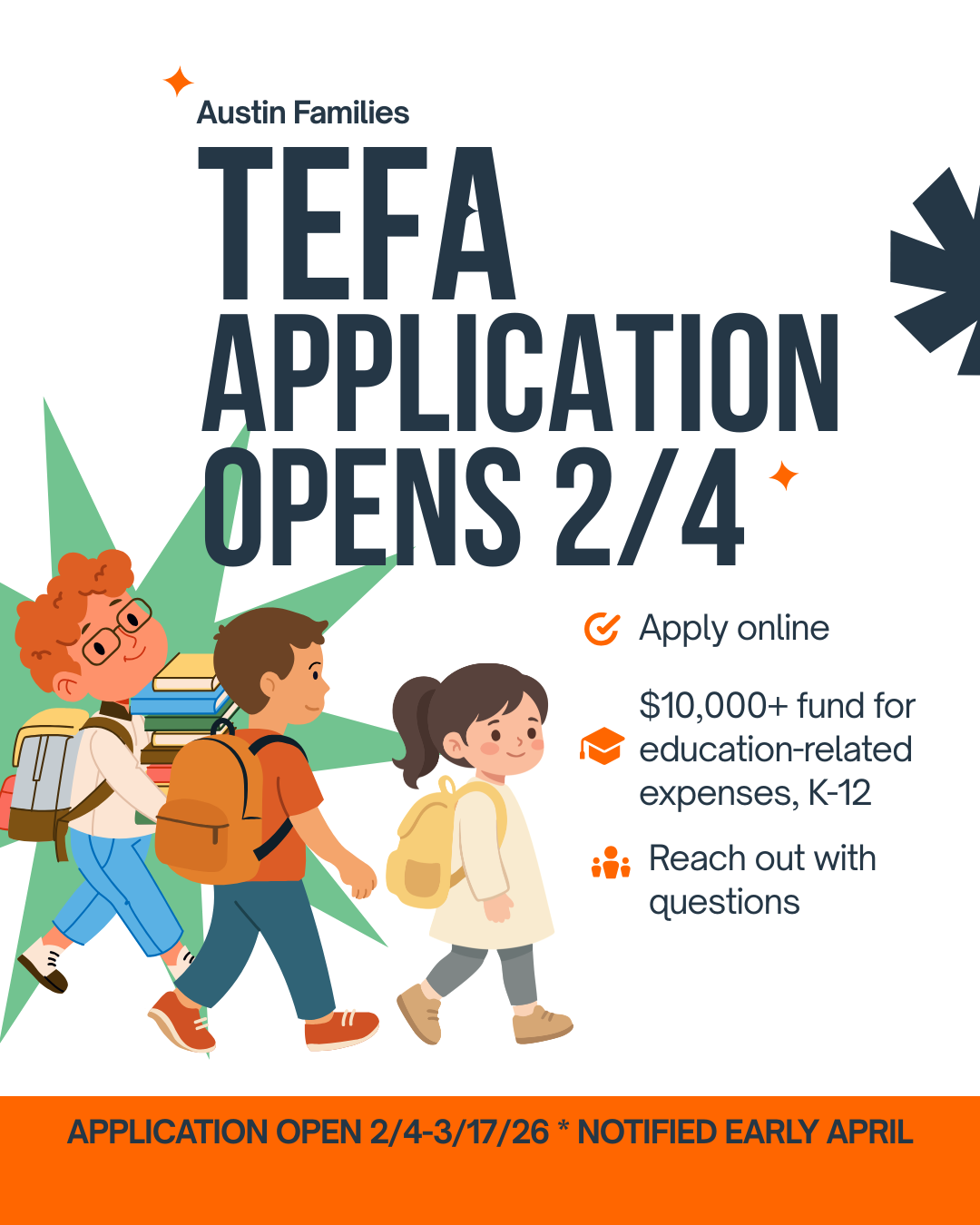 TEFA application is open Feb 4-Mar 17, 2026. This is not a first-come, first-served program. You can apply any time during the application window without affecting your child's chances of receiving funding. Families should expect to be notified early April if they will be receiving TEFA funds for 2026-27 school year.
